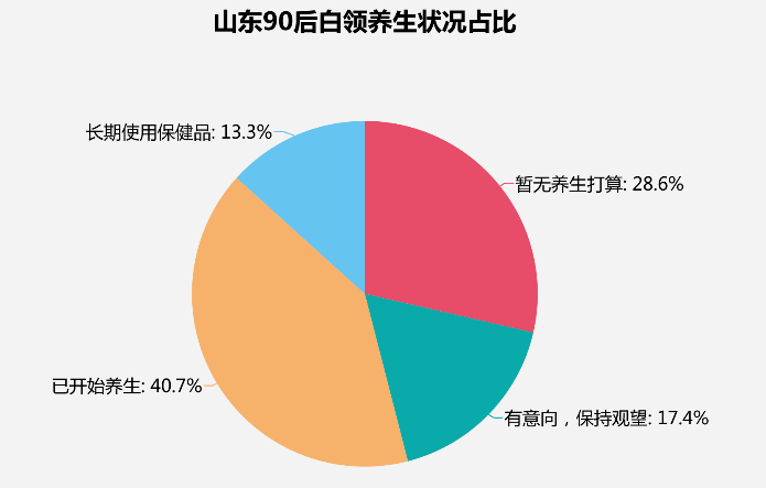 據(jù)統(tǒng)計,現(xiàn)如今中國有一大部分年輕人都開始注重養(yǎng)生,且山東省90后已經(jīng)有過半年輕人開始養(yǎng)生。下圖為山東90后白領養(yǎng)生狀況占比,據(jù)調(diào)查顯示,已有40.7%的白領開始養(yǎng)生;更有13.3%白領表示長期在使用保健品;有17.4%的白領意向養(yǎng)生并持觀望態(tài)度;僅有28.6%的白領表示無養(yǎng)生打算。