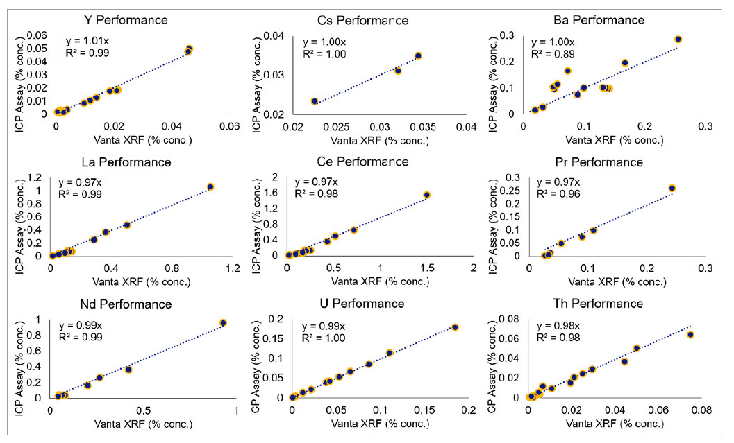 使用Vanta手持式XRF光譜儀,可以對稀土進(jìn)行檢測。手持XRF光譜儀在檢測各種礦產(chǎn)品樣品(包括氟碳酸鹽和次生磷酸鹽)時,表現(xiàn)出非常高的性能。氟碳酸鹽通常是氟碳鈰礦,可提供釔、鈰和鑭;而磷酸鹽通常是獨(dú)居石,不僅含有鑭、鈰、鐠和釹,還含有較重的稀土元素釤和釓,以及放射性較弱的釷。正如每個圖表所示,元素的斜率和R2都接近于1,說明Vanta在檢測氟碳鈰礦石和獨(dú)居石時均表現(xiàn)出很高的準(zhǔn)確性。