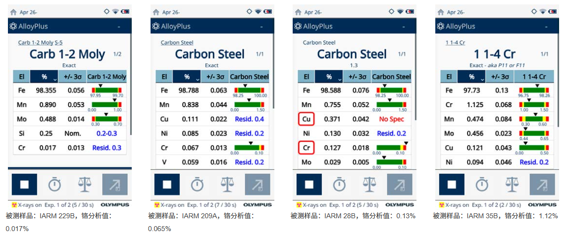 下面幾張圖是Vanta分析儀在對碳鋼中的鉻進行分析的過程中,顯示在分析儀屏幕上的結(jié)果。在這些圖像中我們可以看到,7秒鐘之內(nèi),屏幕上就顯示了預(yù)測流動加速腐蝕所需的鉻含量讀數(shù)。