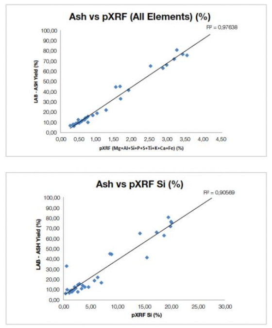 圖1. 奧林巴斯手持式XRF光譜儀獲得的數(shù)據(jù)與經(jīng)認(rèn)證的參考材料額定值之間有著密切的關(guān)聯(lián)性,因此使用組合輕元素替代物(Mg+Al+Si+P+S+Ti+K+Ca+Fe)或僅使用二氧化硅可以有效地估算灰分含量。如果元素組中的元素更全,還可以獲得更好的結(jié)果。