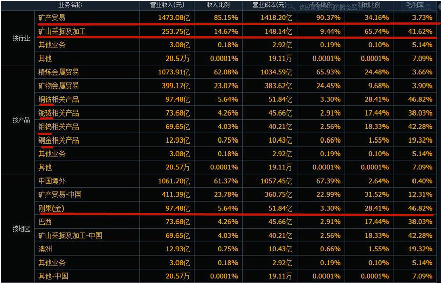 2022年,洛陽鉬業(yè)實現(xiàn)營業(yè)收入1729.91億元,凈利潤為60.67億元,雖然創(chuàng)造歷史最好業(yè)績,但相比于近2000億元的營收,其實際的凈利潤率并不高,而細看主營業(yè)務,其占了收入85%的礦產(chǎn)貿易,毛利率只有3.73%!而其礦產(chǎn)采掘和加工的業(yè)務的毛利率達到了41.62%,貢獻了總利潤的65.74%。