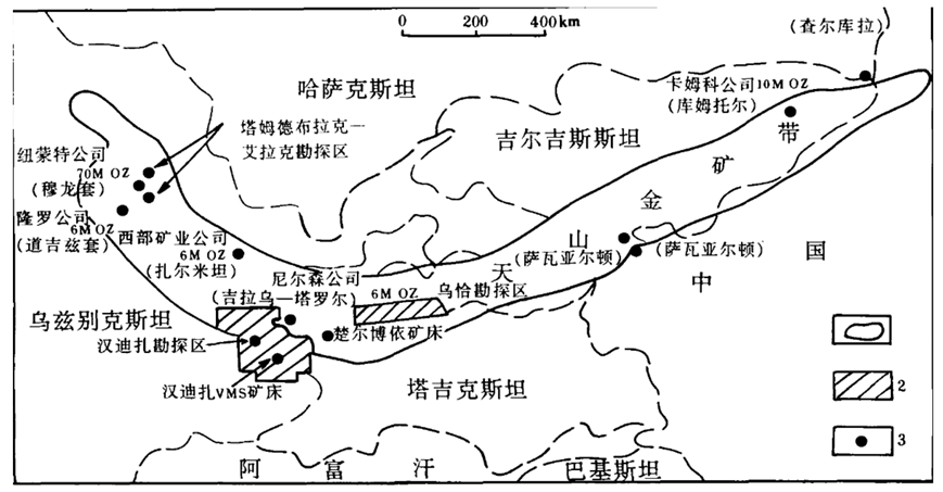 天山西段,從烏茲別克斯坦向東,經(jīng)塔吉克斯坦、吉爾吉斯斯坦到中國新疆,構(gòu)成了世人矚目的巨型金成礦帶,即“亞洲金腰帶”。烏茲別克斯坦、吉爾吉斯斯坦等幾個國家在這條成礦帶上發(fā)現(xiàn)了眾多大型、超大型金礦。其中,最為著名的當(dāng)屬于烏茲別克斯坦的穆龍?zhí)捉鸬V床,該礦是世界級超大型獨(dú)立金礦床,遠(yuǎn)景資源儲量預(yù)估1.7億盎司(5287.6噸),平均品位約3.5克/噸。該礦2022年生產(chǎn)了約1700盎司(約48.2噸)的黃金,是全球第二大在產(chǎn)金礦。