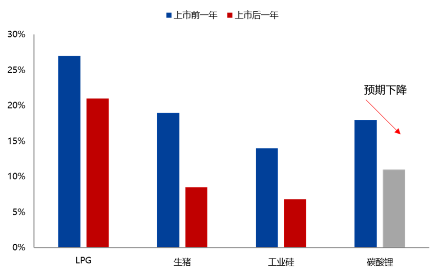 據(jù)相期貨公司預測,參考最近三年新增的品種LPG、生豬和工業(yè)硅,上市后歷史波動率均值較之前明顯下降。最近一年電池級碳酸鋰歷史波動率均值為18%,期貨上市后預計逐步下降至11%左右。