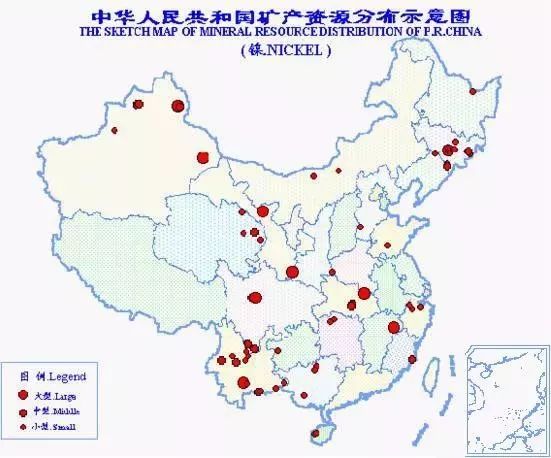中國(guó)鎳礦資源不能滿足需要??偙S袃?chǔ)量鎳784萬(wàn)噸,居世界第9位。鎳礦產(chǎn)地有近100處,分布于18個(gè)省(區(qū))。