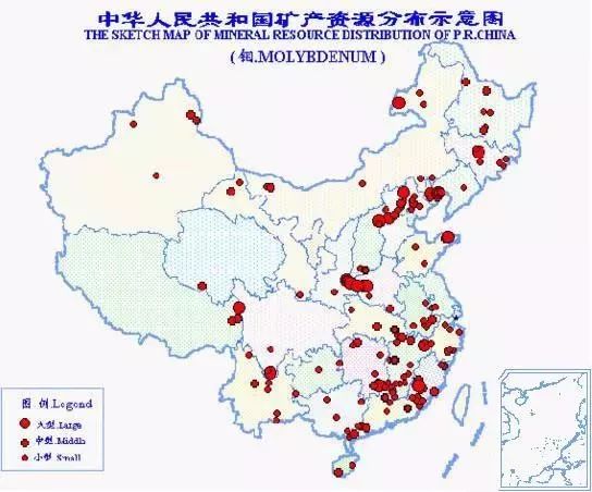 中國(guó)鉬礦資源豐富,總保有儲(chǔ)量鉬840萬(wàn)噸,居世界第2位。探明儲(chǔ)量的礦區(qū)有222處,分布于28個(gè)?。▍^(qū)、市)。以河南省鉬礦資源為最豐富,鉬儲(chǔ)量占全國(guó)總儲(chǔ)量的30.1%。