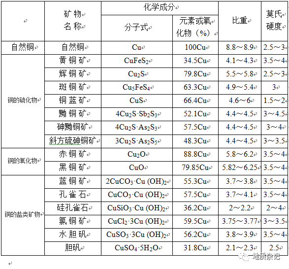 自然銅;銅的硫化物:黃銅礦(含銅34.6%)、斑銅礦(63.3%)、輝銅礦(79.9%)、銅藍(lán)(66.5%)、方黃銅礦(23.4%)、黝銅礦(46.7%)、砷黝銅礦(52.7%)、硫砷銅礦(48.4%);