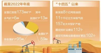 礦產資源是經濟社會發(fā)展的重要物質基礎,礦產資源勘查開發(fā)事關國計民生和國家安全。截至2022年年底,全國已發(fā)現173種礦產;2022年,我國近四成礦產儲量均有上升……日前發(fā)布的《中國礦產資源報告(2023)》顯示,我國推進實施新一輪找礦突破戰(zhàn)略行動效果顯著。