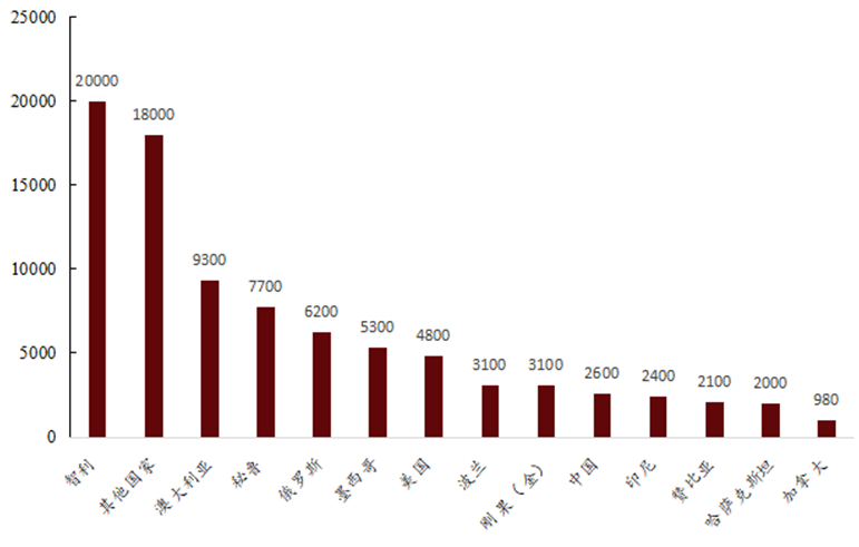 全球銅資源儲量分布較集中,據(jù)USGS數(shù)據(jù),2022年全球銅儲量8.9億噸,其中智利、澳大利亞、秘魯儲量規(guī)模居前,分別占比21%、11%、9%,CR3達到 41%。從供應(yīng)來看,智利、秘魯、剛果(金)為全球銅礦最重要的供給來源,2022年銅礦產(chǎn)量分別達520、220、220萬噸,占全球銅礦供給分別 24%、10%、10%。值得注意的是,智利正面臨礦山老化、品位下降的問題,年產(chǎn)量于2018年見頂于583 萬噸,隨后逐年下滑;秘魯2019年產(chǎn)銅246萬噸,隨后受疫情和當(dāng)?shù)卣值纫蛩財_動有所減量,也在逐年下滑,2022年產(chǎn)量220萬噸;而非洲代表國家剛果(金)銅供給增量顯著,逐漸成長為最重要的供給國之一,年產(chǎn)量從2012年的60萬噸增長到2022年的220 萬噸,與老牌產(chǎn)銅國秘魯相當(dāng)。