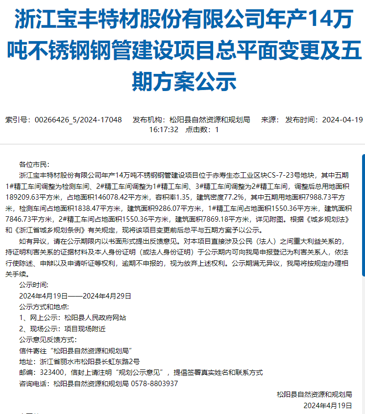 4月19日,麗水市松陽(yáng)縣人民政府發(fā)布,松陽(yáng)縣自然資源和規(guī)劃局就浙江寶豐特材股份有限公司年產(chǎn)14萬(wàn)噸不銹鋼鋼管建設(shè)項(xiàng)目總平面變更及五期方案對(duì)外進(jìn)行公示,公示時(shí)間:2024年4月19日-2024年4月29日。