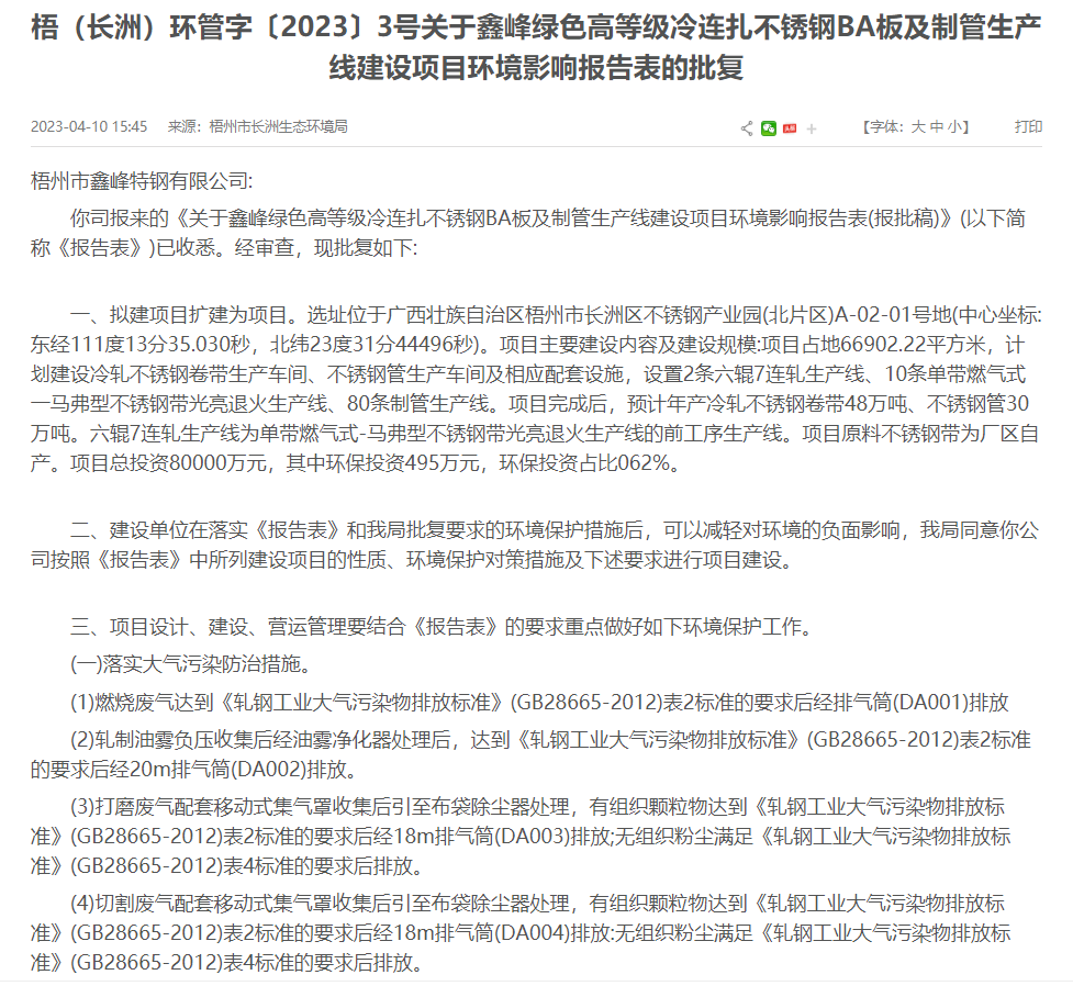 梧州市長(zhǎng)洲生態(tài)環(huán)境局就鑫峰綠色高等級(jí)冷連扎不銹鋼BA板及制管生產(chǎn)線(xiàn)建設(shè)項(xiàng)目環(huán)境影響報(bào)告表作出批復(fù)意見(jiàn)。