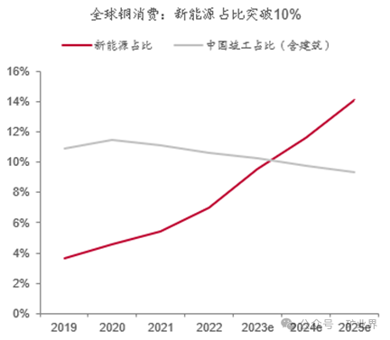 新能源領(lǐng)域?qū)︺~需求的增量,已基本上抵消了國(guó)內(nèi)傳統(tǒng)房地產(chǎn)下滑所帶來(lái)的負(fù)面影響。近日,中泰證券研究所有色金屬首席分析師謝鴻鶴曾表示,2023年全球新能源制造對(duì)銅鋁的消費(fèi)量已經(jīng)占到總消費(fèi)量的10%,而國(guó)內(nèi)房地產(chǎn)竣工端對(duì)銅鋁(指狹義的直接使用部分)的消費(fèi)也在2023年被“壓縮”到了10%附近。