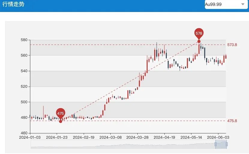 拉長時間看,盡管近期現(xiàn)貨黃金價格有所回落,但年初至6月7日漲幅仍超11%。國內(nèi)金價亦不斷攀升,上海黃金交易所AU9999年內(nèi)最高觸及578元/克,較年初低點475元/克漲幅達21.68%。