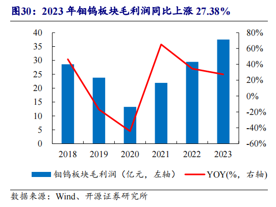 鉬鎢板塊方面,開(kāi)源證券研報(bào)顯示,去年,洛陽(yáng)鉬業(yè)全年鉬鎢產(chǎn)量合計(jì)2.36萬(wàn)噸,營(yíng)收為86.11億元,同比增長(zhǎng)23.63%,毛利為37.51億元,創(chuàng)歷史最高紀(jì)錄。