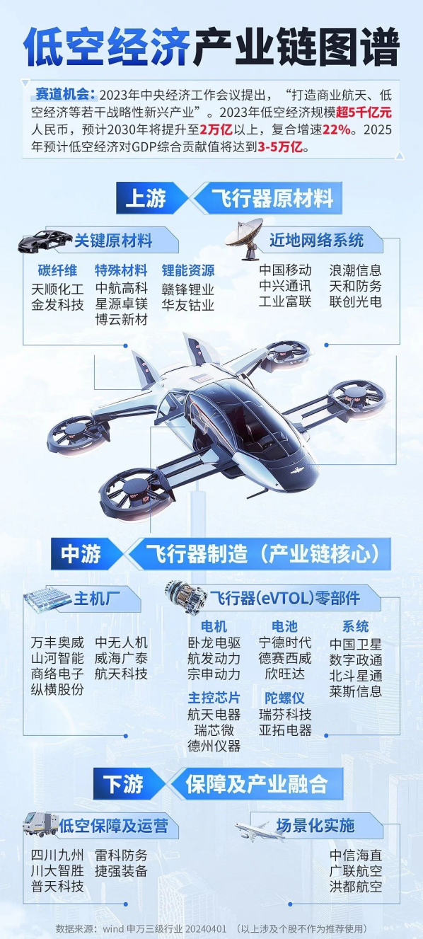 從2019年起,低空空域逐步放開,國(guó)家政策持續(xù)扶持低空經(jīng)濟(jì)的發(fā)展。今年3月份,“低空經(jīng)濟(jì)”首次寫入《政府工作報(bào)告》。同樣是在3月,工業(yè)和信息化部、科學(xué)技術(shù)部、財(cái)政部、中國(guó)民用航空局聯(lián)合印發(fā)《通用航空裝備創(chuàng)新應(yīng)用實(shí)施方案(2024—2030年)》,提出到2030年,推動(dòng)低空經(jīng)濟(jì)形成萬億級(jí)市場(chǎng)規(guī)模。