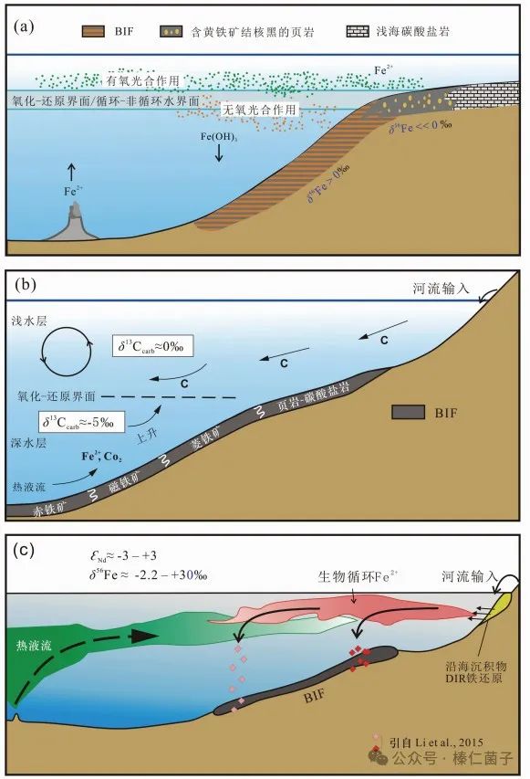 在早期地球,大氣主要成分是二氧化碳,缺少氧氣。地表風(fēng)化作用中,鐵主要呈二價鐵溶解在水中,隨河流被被帶入大海,在海水呈溶解于水的二價鐵化合物富集。因為植物的光合作用,大氣、海洋中二氧化碳不斷減少,氧氣增加。在植物生長比較旺盛的淺海地區(qū),海水中的氧氣含量高,二價鐵被氧化成不溶于水的三價鐵氧化物,沉淀成為條帶狀鐵礦。