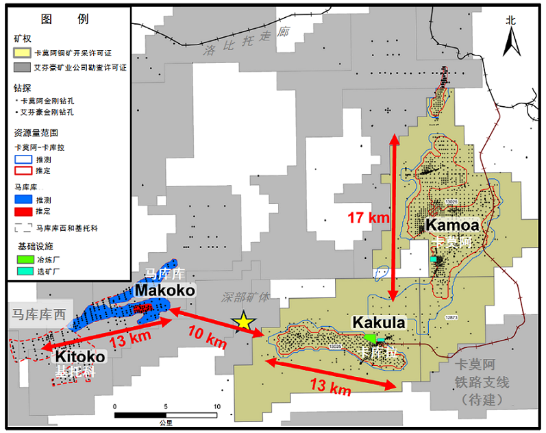 沿走向長度可以同卡庫拉礦體相比,而卡庫拉銅礦床是卡莫阿(Kamoa)-卡庫拉(Kakula)聯(lián)合礦第1和第2階段精礦廠的銅礦石來源??◣炖~礦床西緣距離馬庫庫礦床東緣大約10公里。
