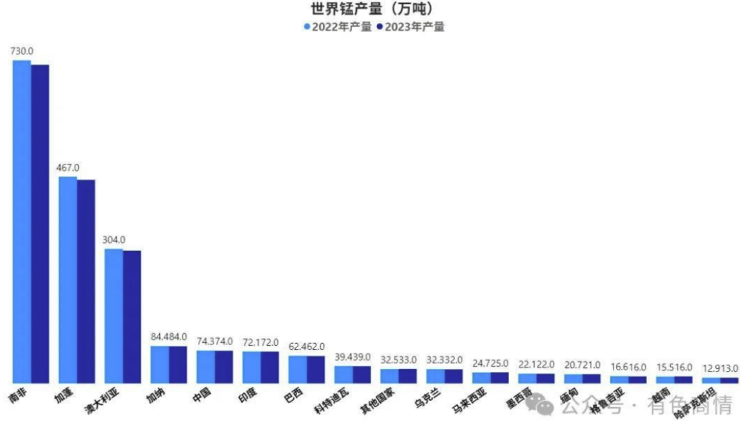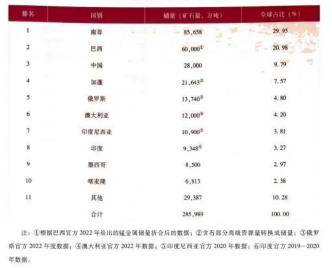 錳礦,是一種非常重要的戰(zhàn)略礦產(chǎn)資源,尤其是富錳礦和優(yōu)質(zhì)錳礦資源,已經(jīng)被中國(guó)列入到緊缺的礦種。錳及其化合物應(yīng)用于國(guó)民經(jīng)濟(jì)的各個(gè)領(lǐng)域,每輛特斯拉Model 3需要6.8公斤錳,而比亞迪刀片電池的磷酸錳鋰技術(shù)對(duì)高純度錳需求激增,錳已成為鋼鐵、新能源、新材料等產(chǎn)業(yè)的基本原料。從儲(chǔ)量分布來看,根據(jù)中國(guó)地調(diào)局發(fā)布的《全球礦產(chǎn)資源儲(chǔ)量評(píng)估報(bào)告2024》顯示,全球錳儲(chǔ)量28.6億噸(礦石量,下同),主要分布在南非(29.95%)、巴西(20.98%)、中國(guó)(9.79%)和加蓬(7.57%)等國(guó),俄羅斯、澳大利亞、印度尼西亞、印度、墨西哥和喀麥隆等國(guó)家也有少量分布。