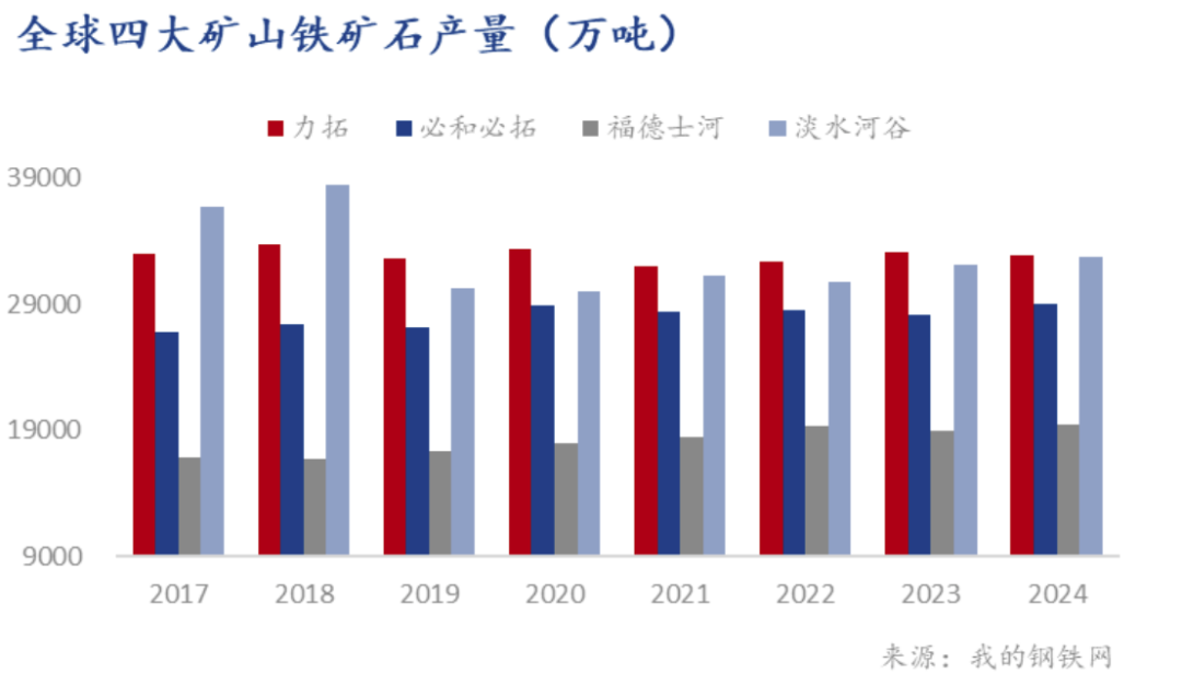 據統(tǒng)計,四大礦山2024年鐵礦石總產量達11.39億噸,同比增加1600萬噸,增幅1.4%。具體來看,澳大利亞三大礦山巨頭表現相對平穩(wěn),合計產量超過8億噸,同比增長930萬噸,而巴西的淡水河谷表現則相對突出,淡水河谷2024年鐵礦石產量達到3.28億噸,同比增加652萬噸,超過原定的3.1-3.2億噸指導目標,創(chuàng)下2018年以來的新高。同時,淡水河谷全年鐵礦石銷量實現了約3.07億噸,同比增長4.02%,達到了2019年以來最好的銷量數據。