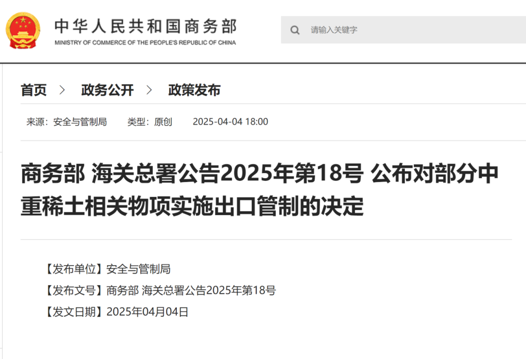 根據(jù)《中華人民共和國(guó)出口管制法》等有關(guān)法律法規(guī),4月4日,商務(wù)部會(huì)同海關(guān)總署發(fā)布關(guān)于對(duì)釤、釓、鋱、鏑、镥、鈧、釔等7類(lèi)中重稀土相關(guān)物項(xiàng)實(shí)施出口管制措施的公告,并于發(fā)布之日起正式實(shí)施。
