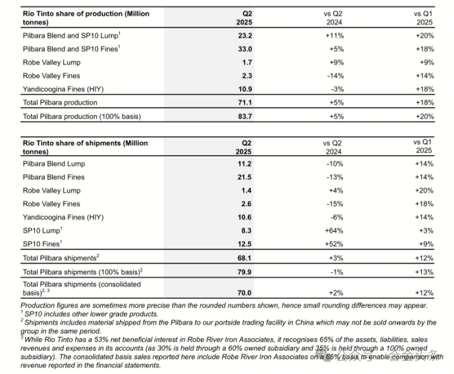截至二季度末,必和必拓2025財(cái)年(2024.07-2025.06)產(chǎn)量為2.88億噸,同比去年持平,完成財(cái)年目標(biāo)(2.82-2.94億噸,100%基準(zhǔn))。