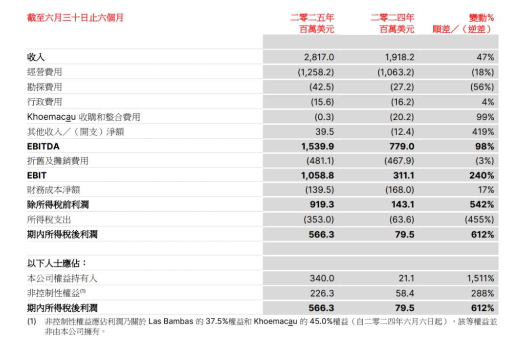 8月12日晚間,五礦資源披露半年業(yè)績,2025年上半年,五礦資源實現(xiàn)收入28.17億美元,同比增長47%;除稅后利潤達5.663億美元,與上年同期的0.795億美元相比,實現(xiàn)了612%增長;公司權益持有人應占利潤3.40億美元,與上年同期的0.211億美元相比,實現(xiàn)了超過15倍的增長。