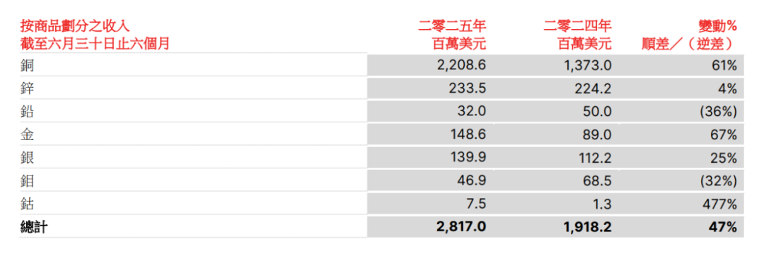 2025年上半年,倫敦金屬交易所(LME)金、銀、鈷等金屬價格分別上漲39%、26%、7%,也帶動五礦資源相關板塊營收的增長。當然,五礦資源業(yè)績的“爆發(fā)”主要得益于銅板塊的量價齊升!