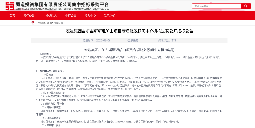 消息源于蜀道投資集團(tuán)集中招標(biāo)采購平臺發(fā)布的《宏達(dá)集團(tuán)吉爾吉斯斯坦礦山項目專項財務(wù)顧問中介機構(gòu)選聘公開招標(biāo)公告》。公告顯示,宏達(dá)集團(tuán)計劃收購億陽資源有限公司 (香港) 100% 股權(quán),通過這一操作,將間接掌控中亞錫有限責(zé)任公司100% 股權(quán),進(jìn)而獲取位于吉爾吉斯斯坦伊塞克湖州的兩宗大型在產(chǎn)礦山礦業(yè)權(quán)。為順利推進(jìn)收購,宏達(dá)集團(tuán)正在公開選聘一家財務(wù)顧問中介機構(gòu),為項目提供專項財稅盡調(diào)及審計服務(wù),項目資金全部來源于企業(yè)自籌。