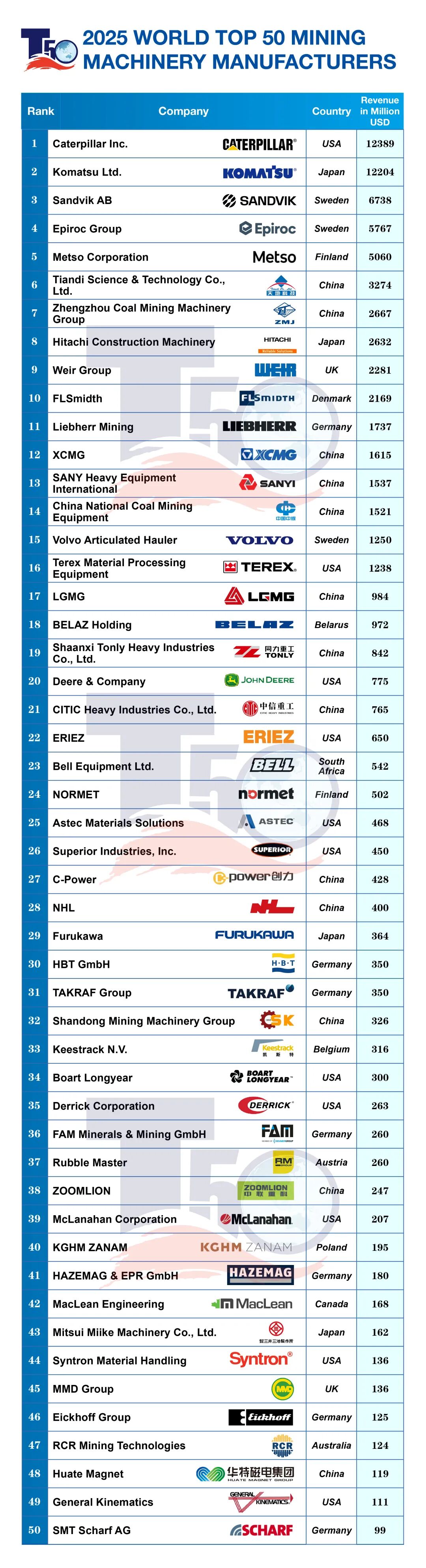 近日,“2025 全球礦山設(shè)備制造商 50 強(qiáng)” 榜單在印度尼西亞雅加達(dá)舉辦的 T50 峰會(huì)亞洲論壇上正式揭曉,揭示了全球礦業(yè)裝備制造業(yè)正在經(jīng)歷深刻變革。本屆榜單顯示,全球礦山設(shè)備制造行業(yè)總銷(xiāo)售額為 766.55 億美元,較上年下降 4.0%,行業(yè)競(jìng)爭(zhēng)格局出現(xiàn)新變化,其中中國(guó)企業(yè)表現(xiàn)尤為搶眼。