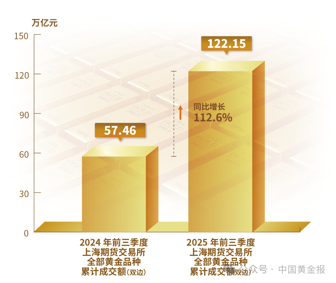 不同品類黃金產品的表現差異明顯。輕克重、附加值高的首飾產品仍保持較強市場吸引力,銷售情況較好。金條需求仍然旺盛,地緣沖突加劇與經濟不確定性使得黃金避險保值的功能進一步凸顯。電子、新能源等產業(yè)的快速發(fā)展使得工業(yè)用金需求穩(wěn)步回升。 黃金市場 2025年前三季度,上海黃金交易所全部黃金品種累計成交量單邊2.38萬噸(雙邊4.76萬噸),同比上升2.45%;累計成交額單邊17.68萬億元(雙邊35.35萬億元),同比上升41.55%。上海期貨交易所全部黃金期貨期權累計成交量單邊10.36萬噸(雙邊20.72萬噸),同比上升59.98%;累計成交額單邊61.08萬億元(雙邊122.15萬億元),同比上升112.6%。