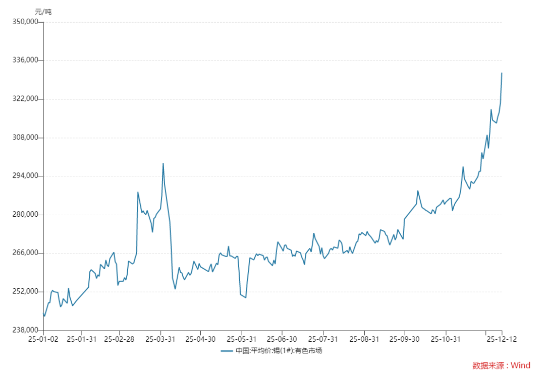 12月12日,國內(nèi)現(xiàn)貨錫價(jià)在突破每噸33萬元整數(shù)關(guān)口后繼續(xù)上行,Wind數(shù)據(jù)顯示,錫(1#)當(dāng)日報(bào)價(jià)達(dá)331,640元/噸,單日上漲10,870元,年內(nèi)累計(jì)漲幅約37%,價(jià)格攀升至2022年6月以來的最高位。同期,滬錫期貨主力合約亦大幅收高,市場看漲情緒顯著。